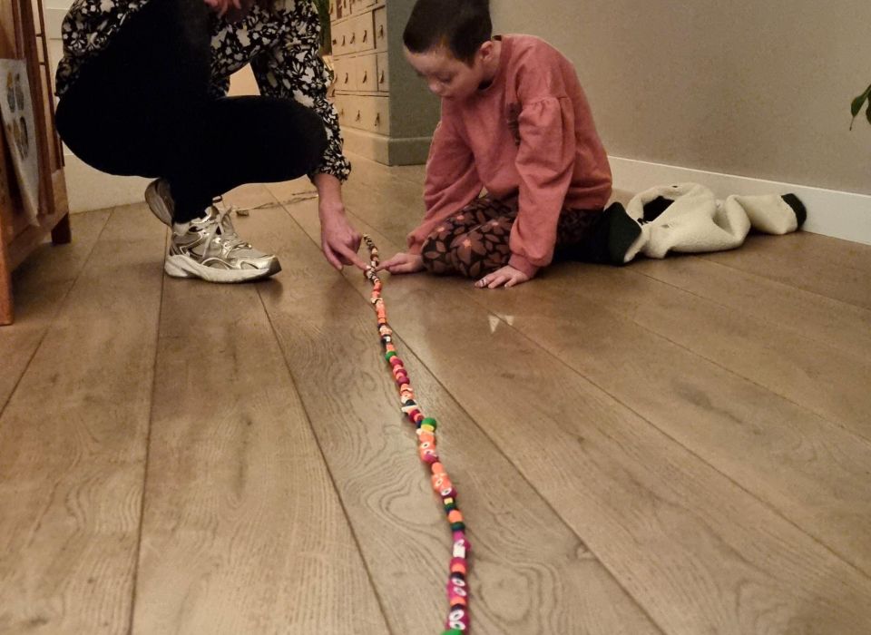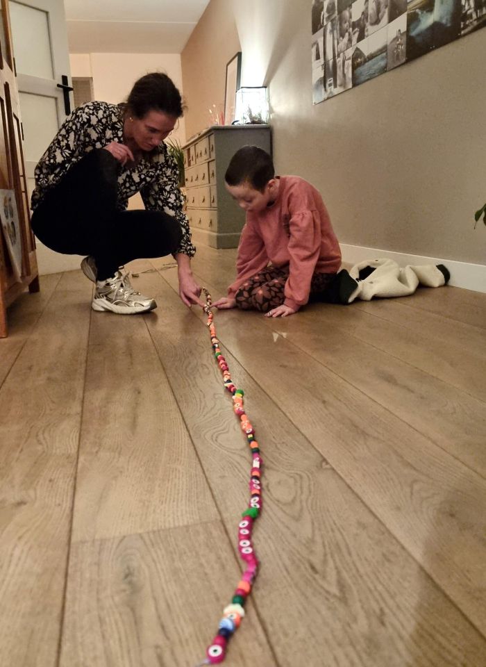 Om 14 uur is het tijd voor de narcose. Het was wat onduidelijk of we hiervoor naar het Wilhelmina kinderziekenhuis aan de overkant moeten of dat dit gewoon in het Maxima zou kunnen. Gelukkig kan dit in het Maxima, dat is wat rustiger omdat Lize hier zelf de operatiekamer binnen kan lopen en bijvoorbeeld geen operatiekleding gedragen hoeft te worden. Het in slaap vallen gaat wat onrustig, maar de operatie gaat goed en na drie kwartier horen we dat we naar de uitslaapkamer mogen. Er is voldoende narcosemiddel gebruikt, want Lize wordt na in totaal bijna 2 uur slapen weer goed wakker. Er is veel gebeurd, ze heeft het wondje van de Porth-a-Cath, een wondje in de rug van de chemoprik, een infuus in de arm en nog een pleister om de vinger van het vingerprikje. De verpleegkundig specialist komt nog langs om te vertellen dat de bloedwaarden goed zijn, en we nemen de planning voor komende tijd door. Het is al laat, dus we eten eerst samen in het restaurant. Voordat we naar huis gaan moet de verzameling kanjerkralen aangevuld worden, we lopen wat weken achter dus we gaan met ruim 30 kralen weer naar huis.